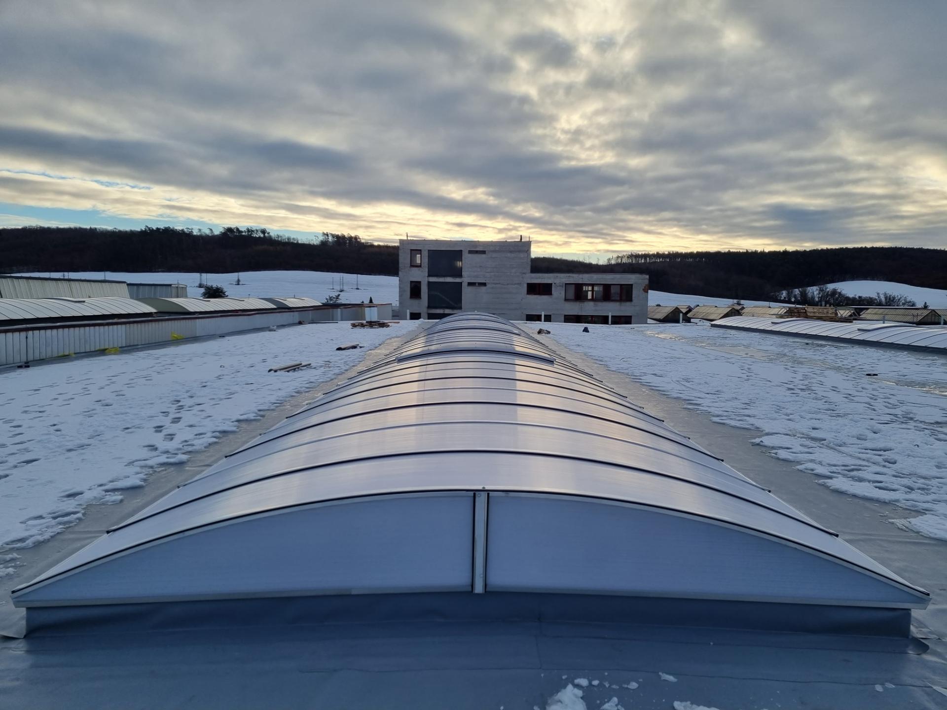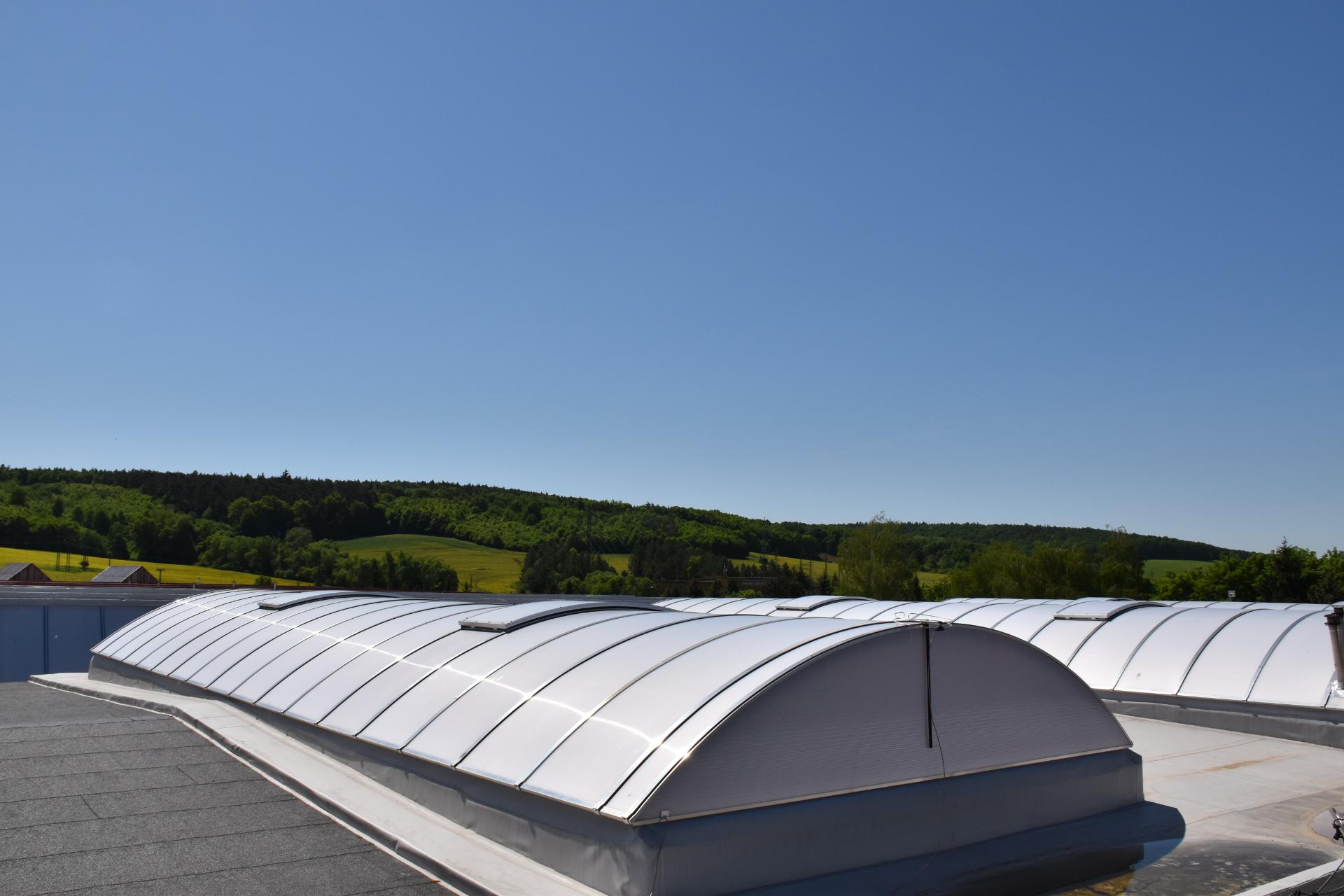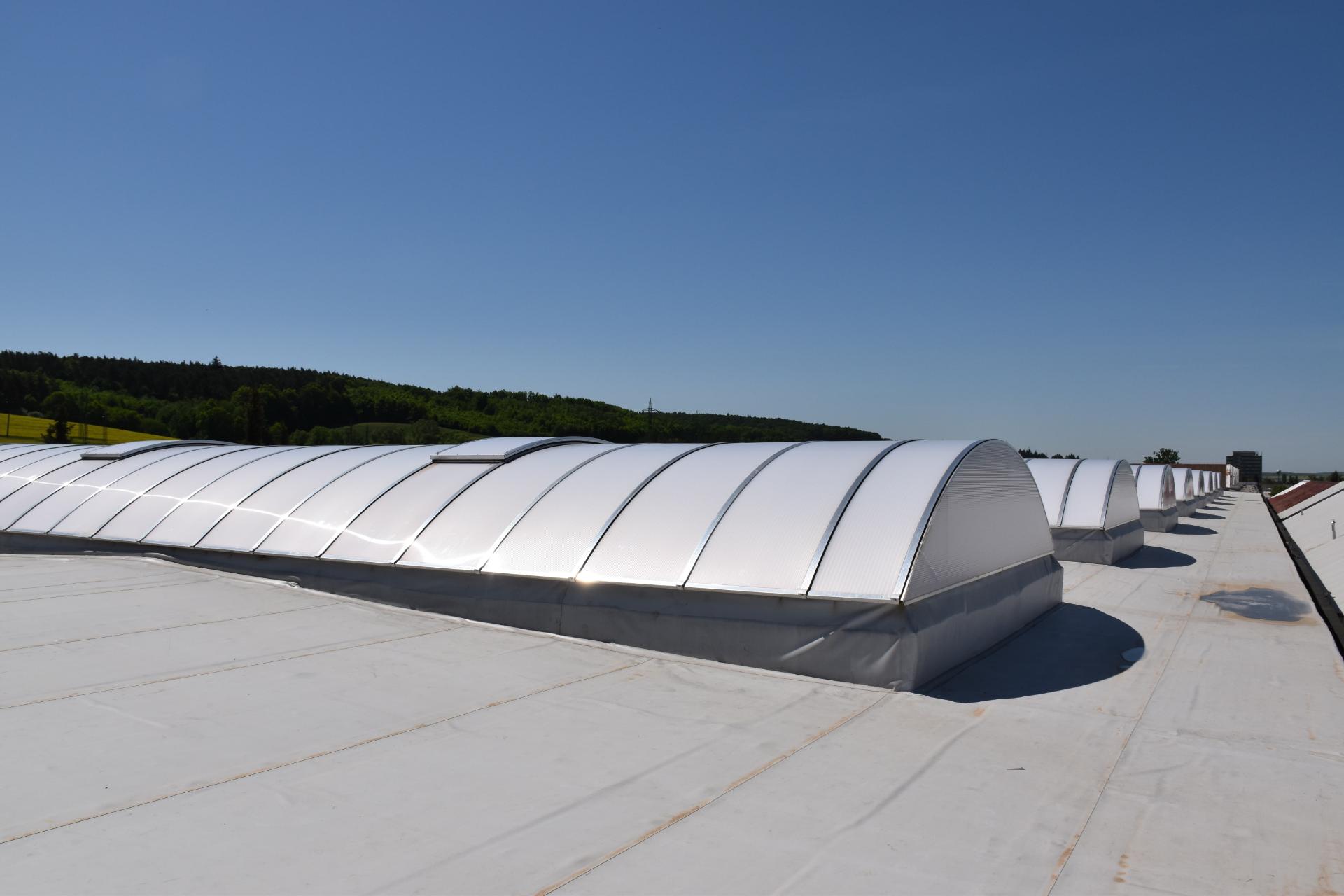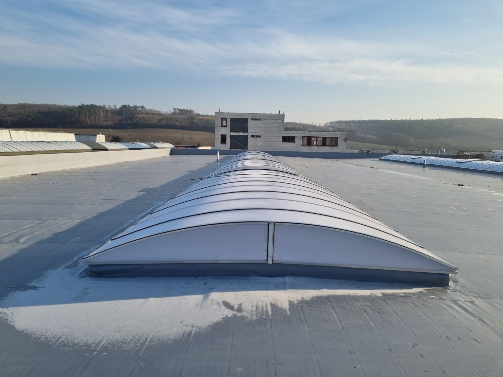 - Instalace světlíků: prostory pod plochou střechou lze přirozeně osvětlit pomocí střešních světlíků, což přináší přirozené světlo a snižuje nároky na umělé osvětlení. Střešní světlíky mohou být instalovány tak, aby zajišťovaly i ventilaci prostoru, což je obzvláště výhodné pro průmyslové a administrativní budovy, kde je často nutné efektivní odvětrávání.