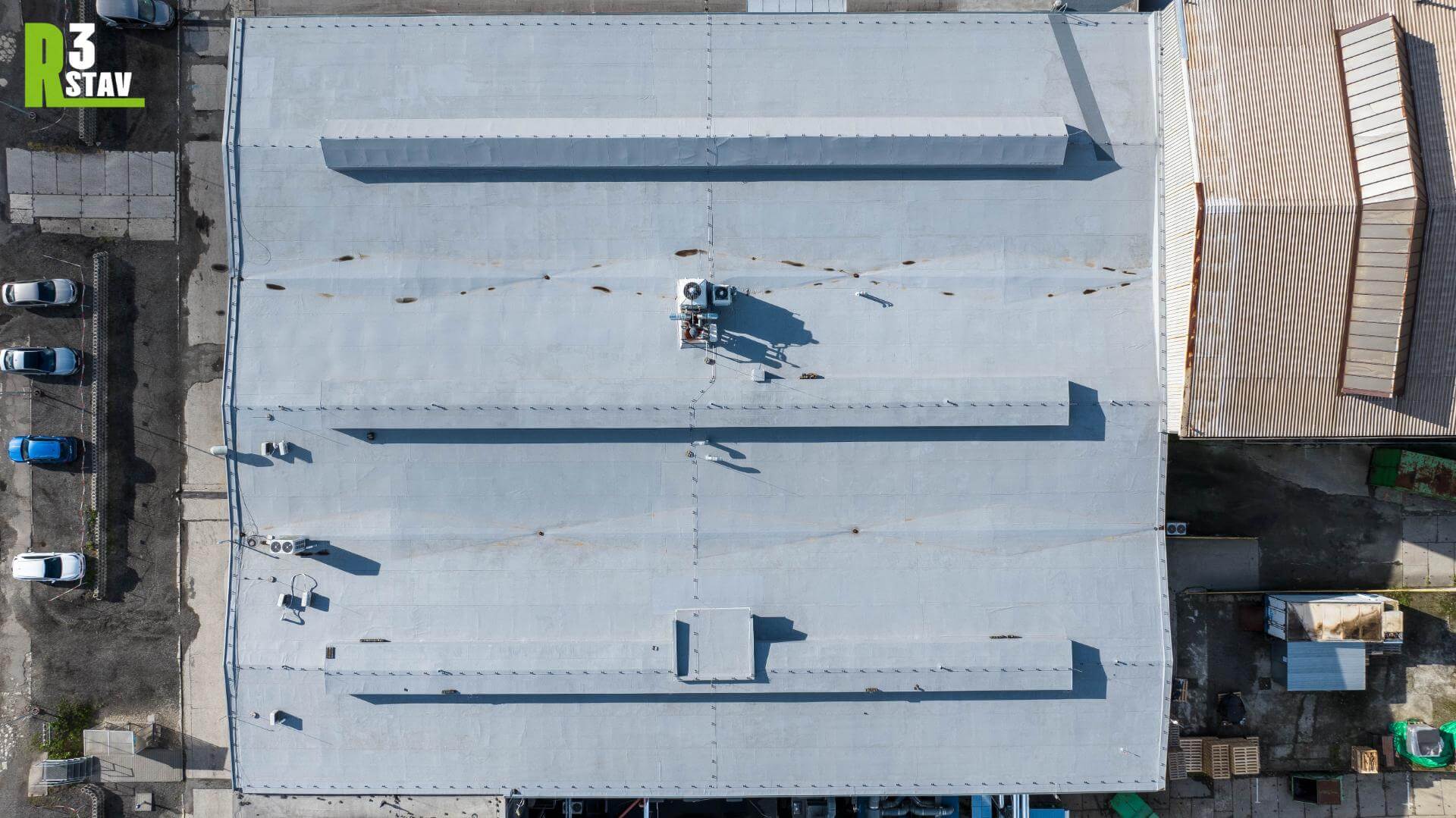 Jako hydroizolační vrstva byla použita PVC fólie o tloušťce 1,5 mm. Na ploše a kolem hran střechy byly nainstalovány systémové klempířské prvky a viplanylové prvky a zároveň byl proveden nový okapový systém. Kromě toho byl na nejrizikovější straně nainstalován záchytný systém proti pádu. Průběh rekonstrukce komplikovalo deštivé počasí, ale přesto jsme dokončili renovaci střešního pláště za 2 měsíce. Tímto projektem jsme nejen zlepšili technický stav budovy, ale také umožnili budoucí instalaci fotovoltaických panelů pro výrobu čisté energie.